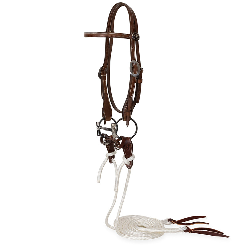 What makes this bridle set unique is our performance horse reins, which are made of the same tried-and-true yachting rope as Clinton’s mecate reins, but feature a thinner diameter to offer lighter contact and more precise cues. The performance horse reins attach to the bridle with the performance horse slobber straps, which are designed specifically to accommodate the reins’ smaller diameter.