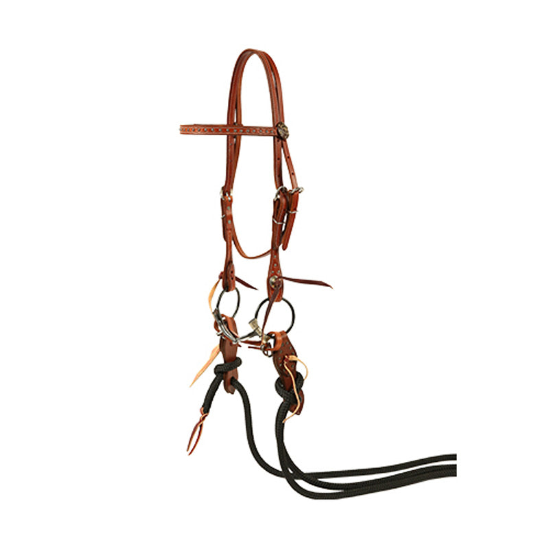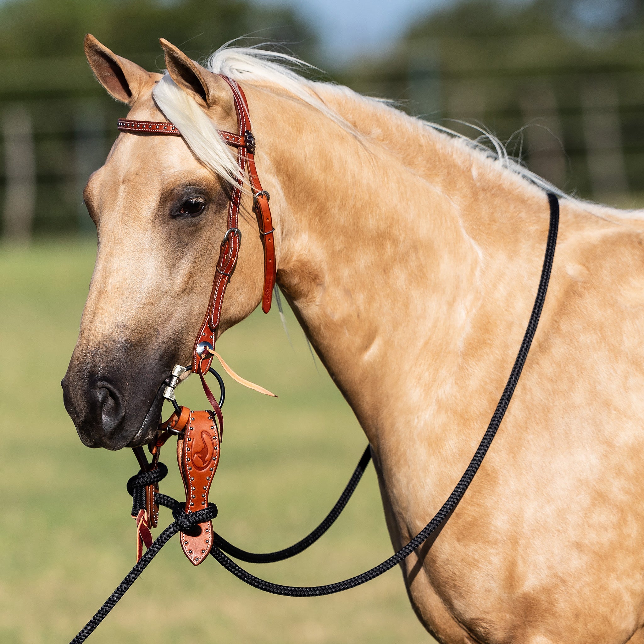 The plain roughout mecate set comes with a plain roughout headstall, a snaffle bit of your choice, a curb strap, your choice of one- or two-piece slobber straps, and a set of durable, 22-foot long rope reins.