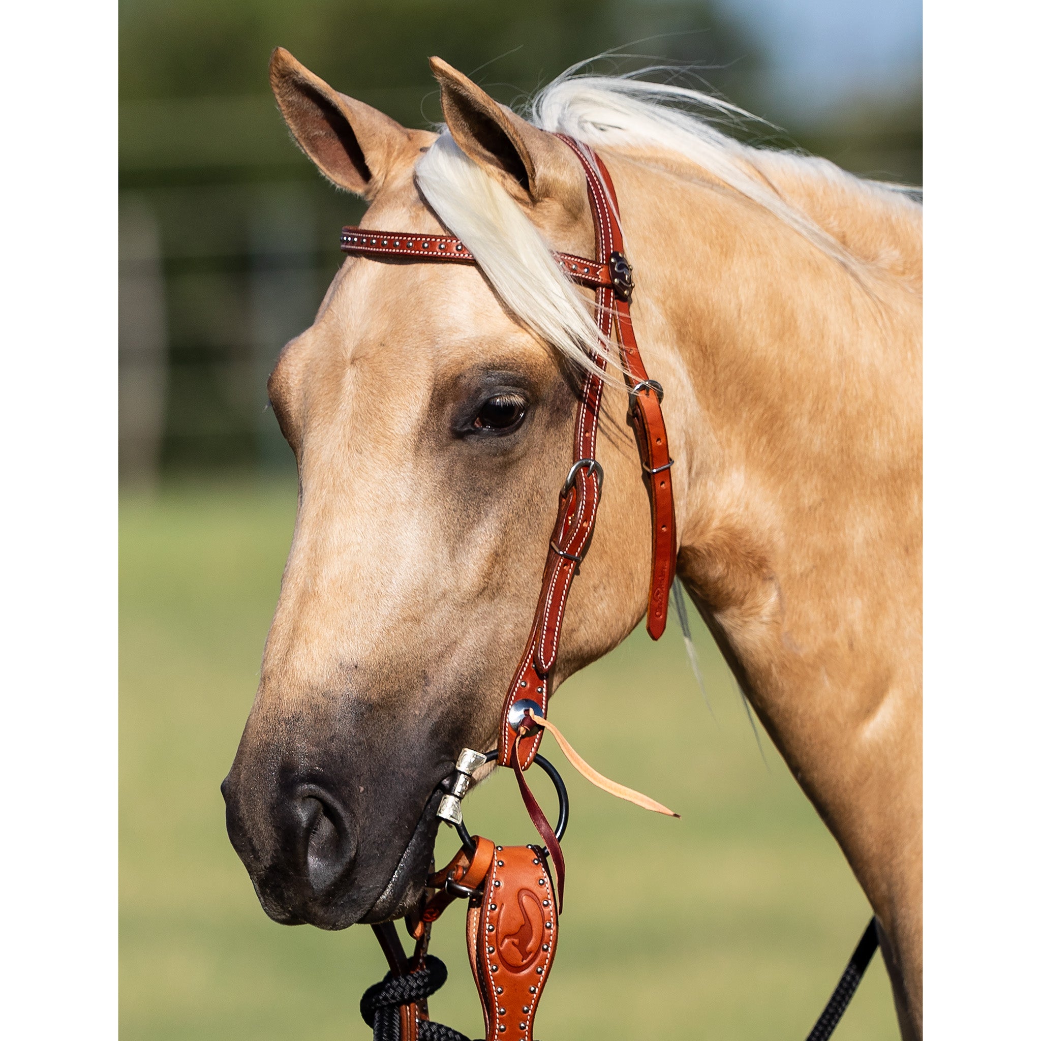 We recommend pairing our chestnut curb strap and slobber straps with the plain roughout headstall for a clean, classy look.