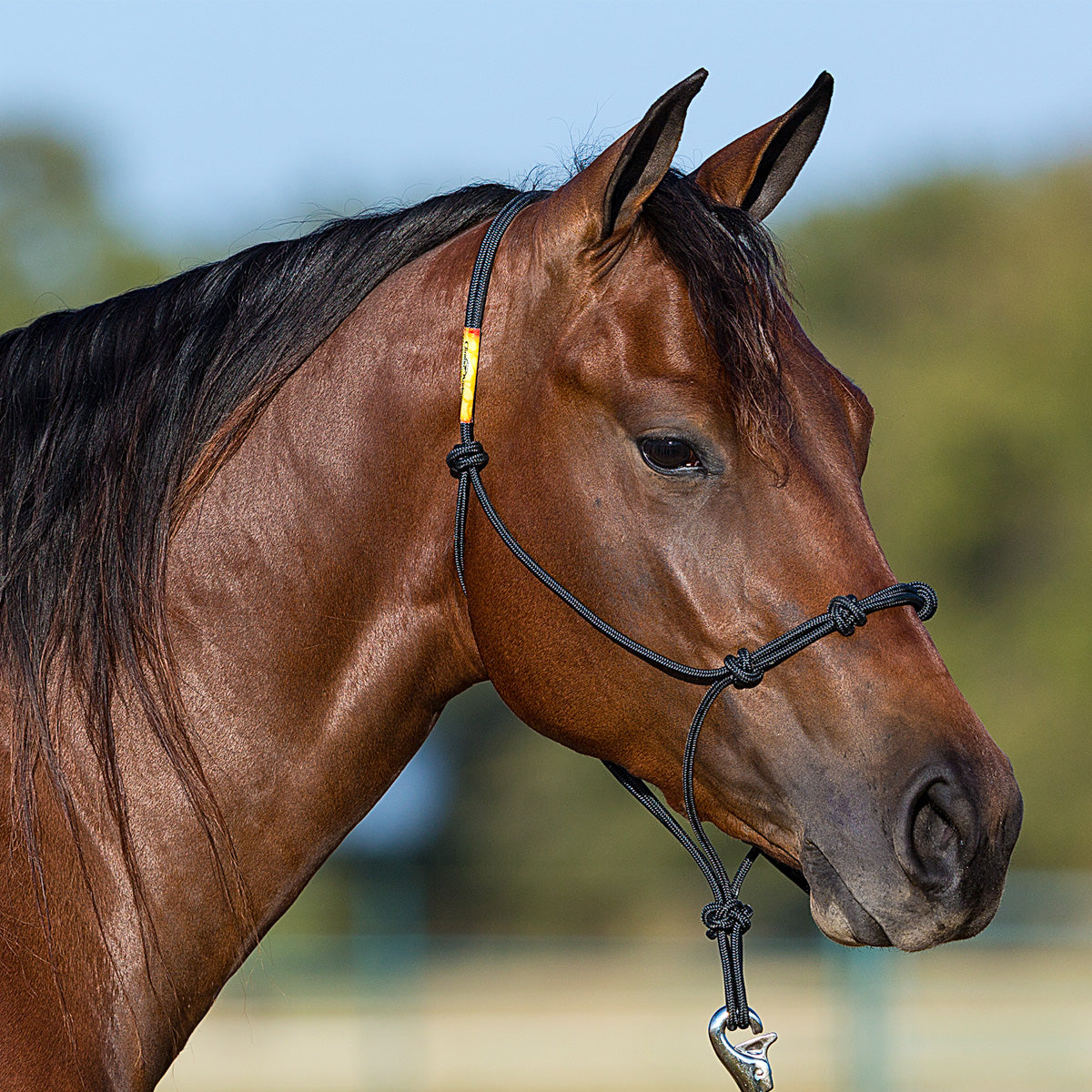 - Shorter distance from the throat knot to the loop knot than other rope halters which stops the cheekpiece from riding up into the horse's eyes.